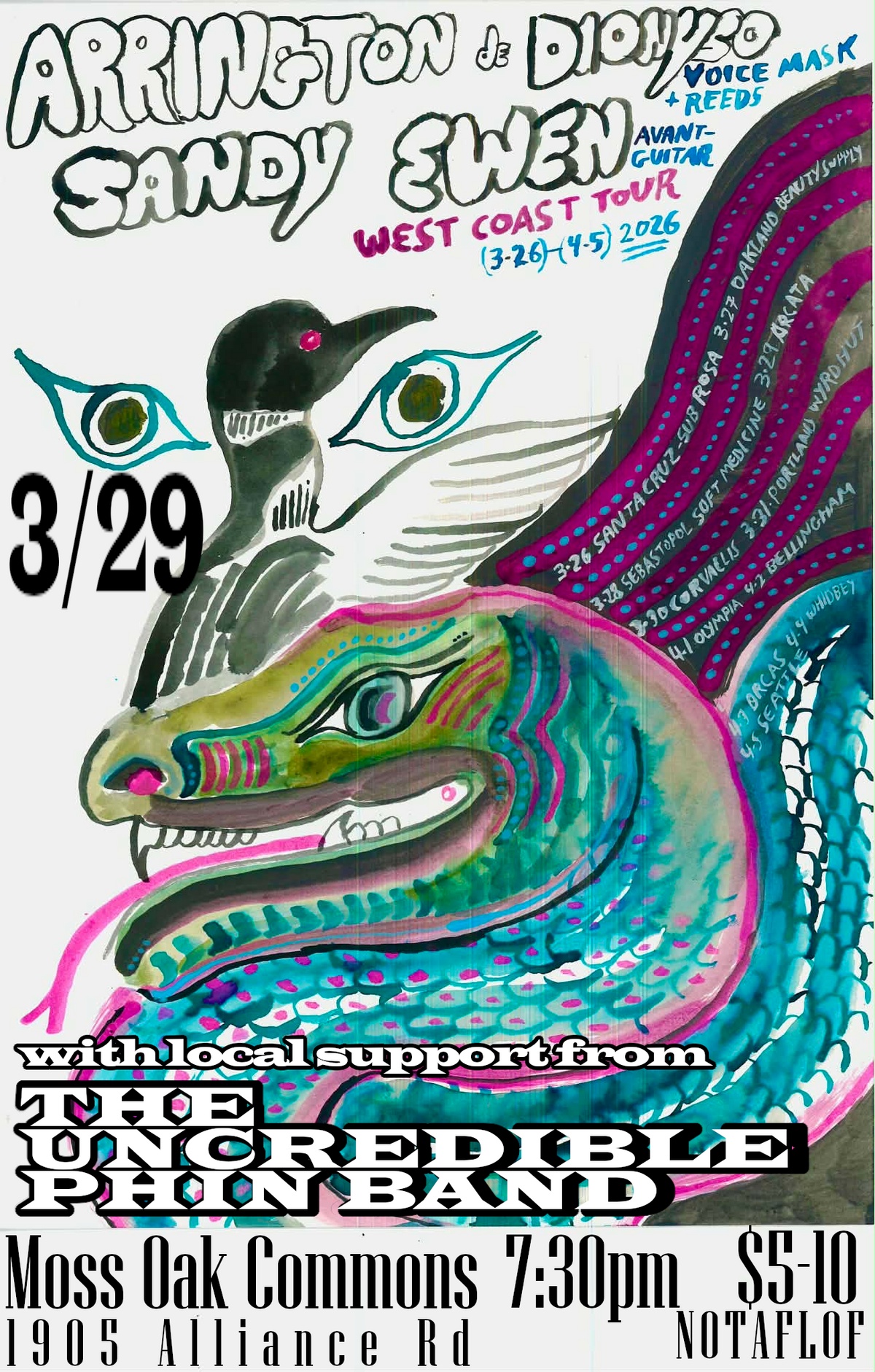 Arrington de Dionyso (voice mask + reeds) and Sandy Ewen (NYC experimental guitar) on their West Coast tour, with local support from The Uncredible Phin Band, "a modern and experimental take on phin music from the Isaan region of Thailand."