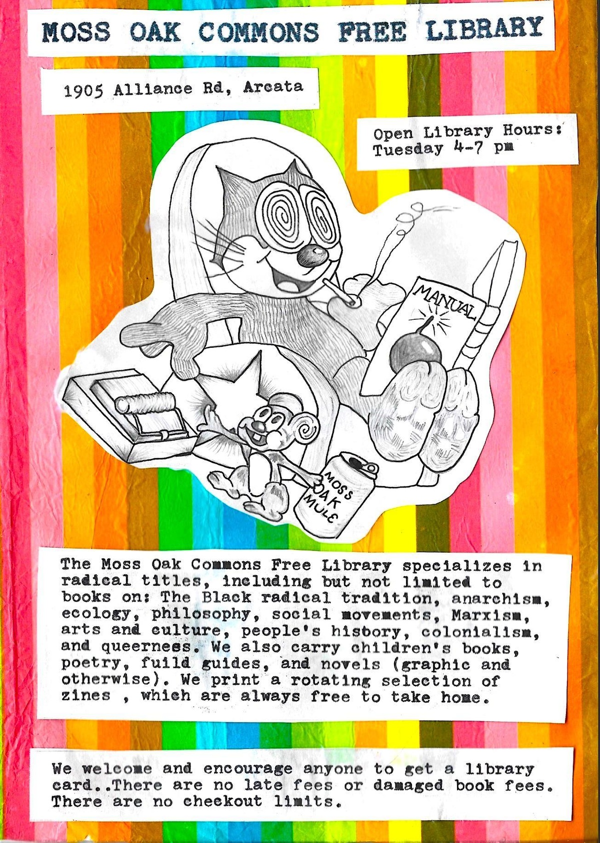 The Moss Oak Commons Free Library specializes in radical titles, including but not limited to books on: Black radical tradition(s), anarchism, ecology, philosophy, social movements, marxism, arts and culture, people’s history, colonialism and queerness. We also carry children's books, poetry, field guides and novels; graphic and otherwise. We print a rotating selection of radical zines which you may read at the library or take home and keep forever.